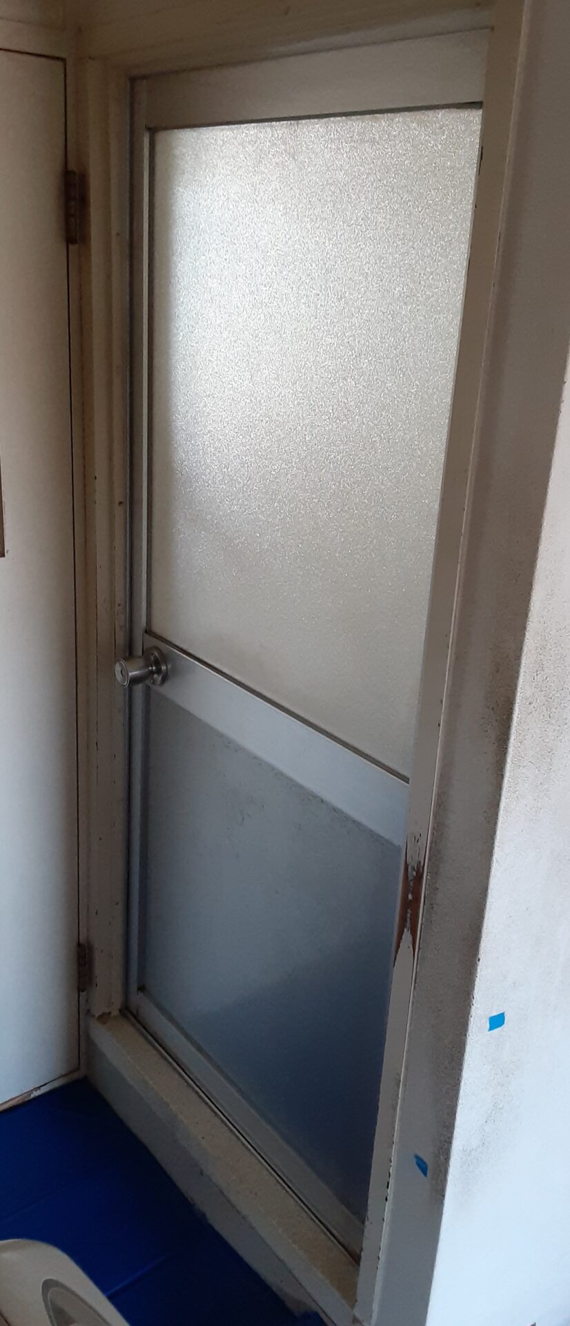 今回は、軽い力で開閉しやすく可動スペースが小さい折れ戸への交換工事を行いました。濡れた手でも操作しやすく高齢者でも使いやすくなります。また、洗い場で人が倒れている場合でも折れながら動くので開けやすいというメリットがあります。